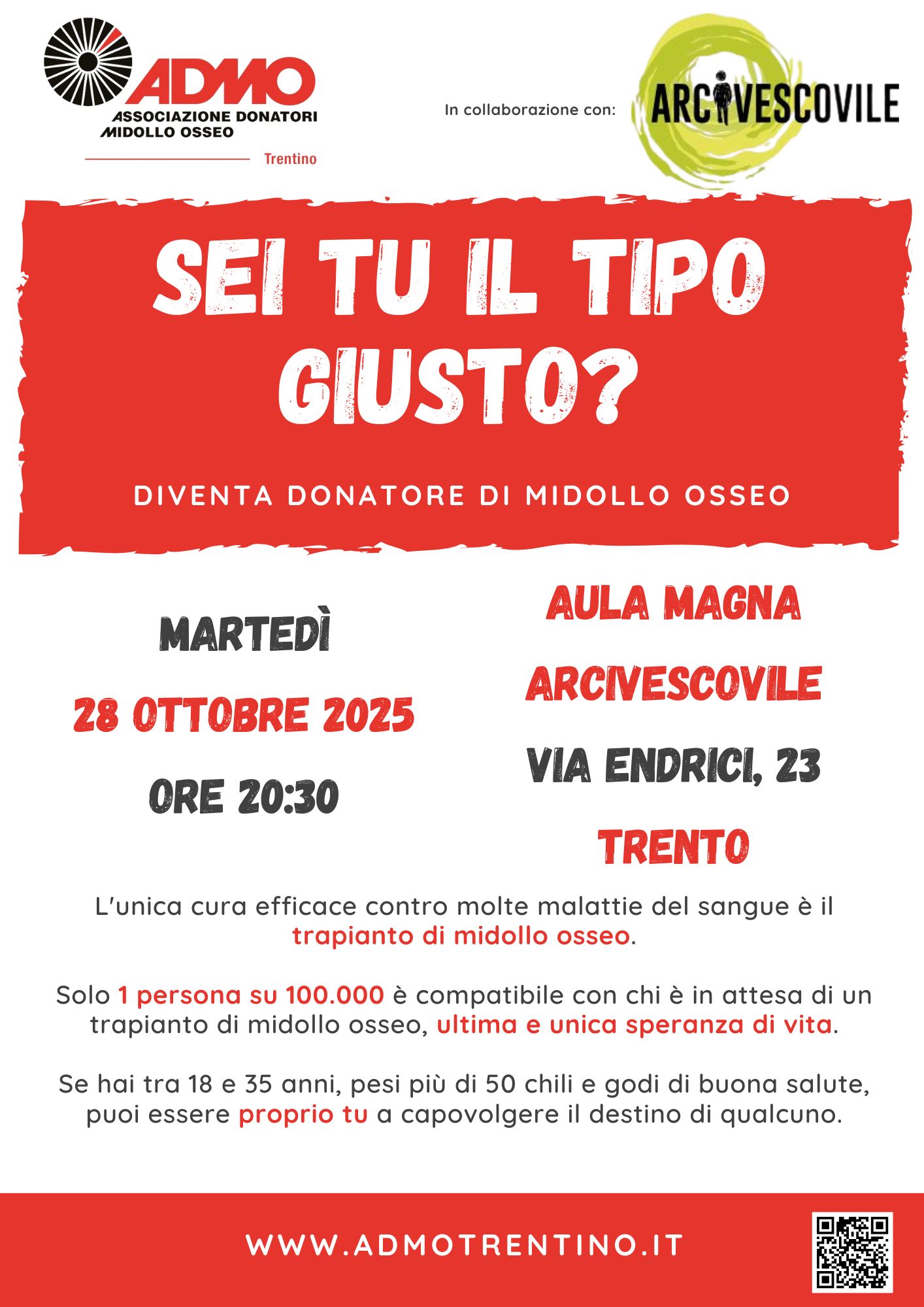 Martedì 28 ottobre 2025 | ADMO Trentino, in collaborazione con il Collegio Arcivescovile, organizza una serata informativa e di sensibilizzazione alla donazione di midollo osseo martedì 28 ottobre alle 20:30 a Trento, nell'Aula Magna del Collegio Arcivescovile (Via Endrici, 23).